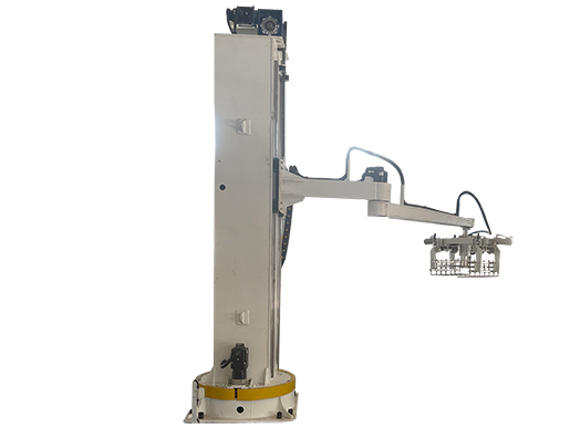 立柱機器人碼垛機的運作流程是將包裝好的物料通過輸送機送至碼垛制定區(qū)定位,立柱機器人通過各軸配合,將夾具運行至物料定位的正上方,當(dāng)物料定位信號發(fā)出時,夾具通過伺服電機控制運動向 下即Z軸向下運動,達到夾具夾持物料高度時,Z軸停止下降,夾具開啟,夾起物料,Z軸伺服電機反轉(zhuǎn),將夾具升到安全高度后,通過客戶預(yù)設(shè)程序?qū)⑽锪纤椭链a垛位上方,Z軸下降,使物料到達放置 點,此時夾具打開,將物料碼入制定位置,重復(fù)以上動作,把整個托盤碼垛完以后,報警提示,提醒已經(jīng)碼垛完成。人工叉車將碼垛好的托盤運走,放入新的托盤,重新往復(fù)動作來完成批量生產(chǎn)碼垛 入庫。